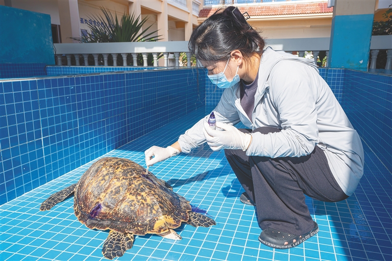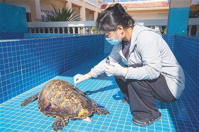 海龟运抵保护中心后,北岛渔民符永波和海南师范大学的张婷博士立即对海龟的健康状况进行检查。“绿海龟的后鳍无力,要让它在这静养。”“太平洋丽龟有伤口,要做伤口处理。”检查完毕,大家一起对两只海龟进行治疗,并放入盛满清澈海水的养殖池内。