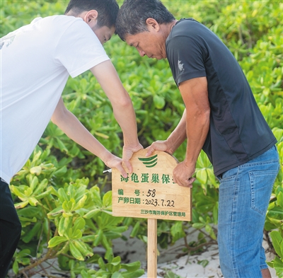 图③为7月22日,工作人员和渔民给海龟巢插牌登记。