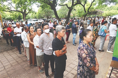 7月23日,选民在柬埔寨首都金边一处投票站排队投票。