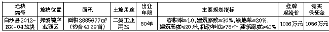 二、竞买人资格及竞买要求:(一)凡中华人民共和国境内外的法人、自然人或其他组织(法律另有规定者除外)均可申请参加竞买,申请人应单独申请竞买。本次挂牌出让不接受联合竞买,不接受电话、邮寄、电子、口头报价。属境外机构(含港、澳、台地区)申请参与竞买的,需按照规定提交商务主管部门核发的《外商投资企业批准证书》和工商主管部门核发的《营业执照》。(二)申请人存在下列情形之一的不得参加本次挂牌出让:1.在白沙黎族自治县行政辖区内因自身原因造成土地闲置,并未及时纠正的;2.在白沙黎族自治县行政辖区内存在通过恶意串通等非法手段竞得建设用地的、竞得土地后不及时签订成交确认书或出让合同的,或拖欠土地出让金且未及时改正的;3.被人民法院列入失信被执行名单和被税务系统列入重大税收违法案件联合惩戒名单的企业法人和个人;4.根据海南省自然资源和规划厅《关于加强土地供应竞买人资格审核的通知》(琼自然资函〔2020〕1753号)文件规定,为加强非法占地、违法建设行为的惩戒力度,对于非法占地、违法建设行为已经处置到位并组织供应的土地,要加强对该涉案宗地供应时竞买人的资格审查,严格限制原非法占地、违法建设行为人参与该宗地的竞买。(三)申请人应当按规定缴交土地竞买保证金,由白沙黎族自治县自然资源和规划局审核确认并签发竞买资格确认书。(四)合同签订和土地出让价款支付。地块出让成交后,在20个工作日内签订《国有建设用地使用权出让合同》。竞得人交纳的竞买保证金自动转作受让地块的土地出让价款,受让人应当在出让合同生效之日起60日内付清土地出让金。三、本次国有建设用地使用权挂牌出让设有底价,按照出价最高且不低于底价的原则确定竞得人。四、竞买咨询及报名期限:本次挂牌出让的详细资料和具体要求,见挂牌出让手册及其他相关文件。手册和文件可从海南省建设用地使用权和矿业权网上交易系统(以下简称网上交易系统,网址:http://lr.hainan.gov.cn:9002)查看和打印。竞买人持CA数字证书实名登录网上交易系统进行相关操作,系统注册及证书办理详见《海南省建设用地使用权和矿业权网上交易系统用户手册》。挂牌出让文件所载内容亦为本公告的组成部分。本次国有建设用地使用权实行网上报名线下竞价,有意向的竞买人可登录网上交易系统提交竞买申请,按要求上传竞买申请文件。报名期限:2023年7月25日至2023年8月23日17:00(以竞买保证金实际到账为准)。五、竞买保证金:竞买人须按挂牌起始价全额支付竞买保证金,挂牌成交后,该竞买保证金转作土地出让金。本宗地可采取银行保函方式缴纳竞买保证金,具体要求详见挂牌手册。六、资格确认:经审查,申请人按规定交纳竞买保证金,具备申请条件的,在2023年8月23日17:30前确认其竞买资格。七、挂牌报价时间及地点:挂牌时间:起始时间:2023年8月14日8:30;截止时间:2023年8月25日16:00;挂牌地点:海南省政府会展楼二楼省公共资源交易服务中心土地交易厅进行。本次竞买活动只接受书面报价,不接受电话、邮寄、电子、口头等其他方式报价。受理报名、报价时间:报名报价期限内8:30至11:30 及14:30至17:30(节假日除外)。本公告所指时间均为北京时间。八、其他需要公告的事项:(一)根据《关于印发〈海南省建设用地出让控制指标(试行)〉的通知》(琼国土资规〔2018〕7号)和《关于实施产业项目发展和用地准入协议的指导意见》(琼国土资规〔2018〕8号)有关规定,本次出让宗地工业用地控制指标,投资强度为不低于300万元/亩,不设定年度产值指标和年度税收指标,达产年限5年,以上出让控制指标按规定列入《产业项目发展和用地准入协议》,属于协议内容的组成部分。竞得人在签订《国有建设用地使用权出让合同》时,须提交与白沙黎族自治县邦溪农林产品(南药)加工与交易基地管理委员会签订的《产业项目发展和用地准入协议》,并严格按照协议约定内容进行开发建设,否则将承担相关违约责任。(二)本次出让地块按净地条件出让,即土地权利清晰、安置补偿落实到位、地上附着物清表、无法律经济纠纷、土地开发利用规划条件明确、符合土壤环境质量要求、具备动工开发所必需条件。竞买人应当现场踏勘出让地块,竞买人申请参加竞买的,视为对出让地块净地条件无异议。(三)竞得人在足额缴纳全部成交价款和相关税费后,依照规定程序办理用地和土地登记手续。竞得人须在取得土地使用权之日起一年内动工开发建设,项目整体建设必须在三年内完成,如造成土地闲置,按照《海南自由贸易港闲置土地处置若干规定》执行。(四)竞得人取得地块后须按批准的规划方案进行建设。挂牌地块出让后,任何单位和个人无权擅自更改规划和建设条件。因非企业原因确需调整的,必须依据相关规定的公开的程序进行,由开发建设单位提出申请调整规划建设条件而不按期开工的,必须收回土地使用权,重新按拍卖、挂牌方式出让土地。(五)该地块若实施装配式建筑,须按装配式建筑有关规定进行。九、本次挂牌事项如有变更,届时以变更公告为准。十、咨询方式:联系地址:白沙黎族自治县牙叉镇方溪路;咨询电话:0898-27715862 18084630580;联系人:符女士、洪先生;查询网址:http://zw.hainan.gov.cn/ggzy/;http://lr.hainan.gov.cn;http://www.landchina.com