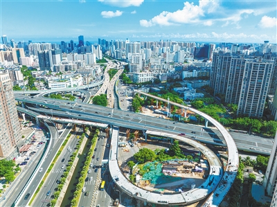 海口龙昆南立交匝道完善工程项目于去年5月开工,目前各个匝道及桥梁逐渐成形。图为7月23日拍摄的项目俯瞰图。据悉,该项目建成通车后,龙昆南立交可以实现更多方向的互联互通,进一步提高通行效率。本报记者 李天平 摄