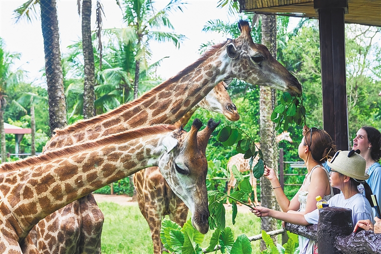 7月23日,海南热带野生动植物园,游客与长颈鹿亲密互动。