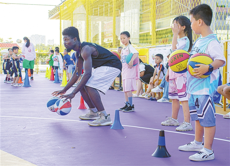 7月26日,在海口市龙华区一处篮球场,外籍教练给孩子们演示打篮球的基本动作。