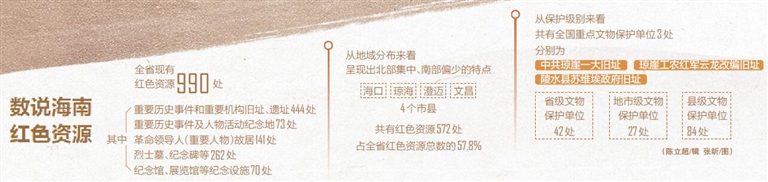 中共海南省委党史研究室有关负责人介绍,海南特殊的地理位置与革命进程,使得琼州大地形成了独具特色的红色文化。我省现有红色资源990处,其中重要历史事件和重要机构旧址、遗址444处,用好这些红色资源,意义重大。