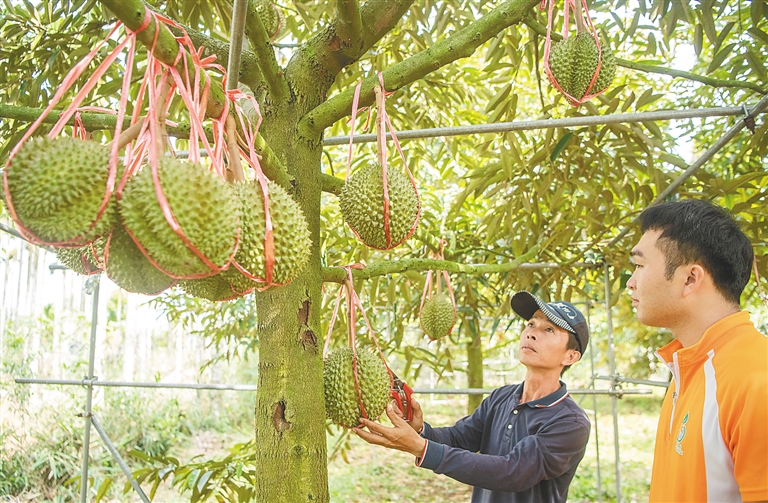 在距离红庄村约20分钟车程的琼海市大路镇“世界热带水果之窗”基地,近日也频频传来好消息:首批试种的猫山王、黑刺等11种名优榴莲进入成熟期。