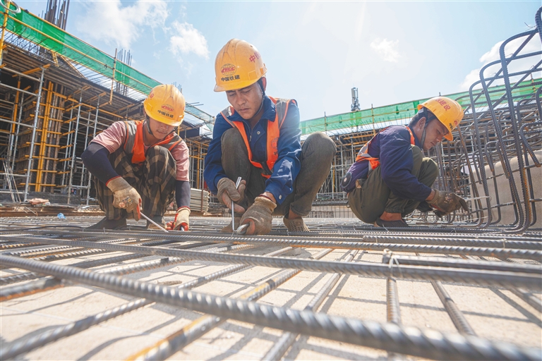 7月27日,中铁建设集团承建的海口琼山区博雅片区(一期)城市更新项目工地上,工人在抓紧作业。