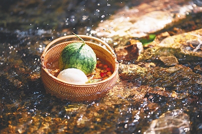 夏令食品,比如各种瓜果,冰镇过的自是最好。三国曹丕在《与朝歌令吴质书》中就说:“浮甘瓜于清泉,沉朱李于寒水。”此后,“浮瓜沉李”俨然成为冰镇食品的代名词。南宋孟元老在《东京梦华录》中记载:“都人最重三伏,盖六月中别无时节,往往风亭水榭,峻宇高楼,雪槛冰盘,浮瓜沉李,流杯曲沼,苞鲊新荷,远迩笙歌,通夕而罢。”这等解暑方法,想必十分惬意了。