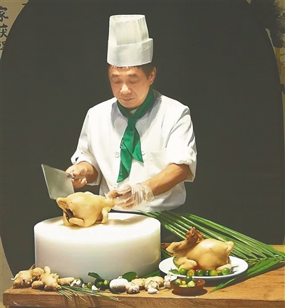 冒着热气的鸡皮油光发亮,用筷子一戳,黄色鸡油流出,一股清香扑面而来。手起刀落,不一会儿,一盘码放整齐的鸡块便准备好了。
