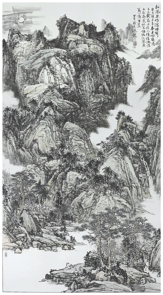 “画如其人。”乔德龙的艺术创作展现出其丰厚的艺术修养和人品涵养,是文化情怀的释放、风骨气度的呈现。而对于早年踏上海南这片热土,辛勤耕耘且在中国画领域取得卓凡成就,又先后举办20多次艺术个展的乔德龙来说,海南美术界对他早已熟悉不过。说到乔德龙的中国画,我们应该回想到1984年第六届全国美术作品展览。那时,他才学横溢,同时以三件作品入选,次年就加入了中国美协,成为贵州、海南画界至今流传的一段佳话。乔德龙是一个较为全面的中国画家,尤其是人物和山水,而他从事山水画的创作应该追溯到上世纪六十年代。当时,他在极为偏僻的大山深处生活,劳作之余,坚持不辍临摹了许多当时能找到的历代山水画印刷品,后来回到工作单位仍然每日抽空临习,不断修炼内功打下扎实的基础。乔德龙又是一位有思想、有追求、有担当的艺术家。他的诗词书画印基础牢固,能对表达的对象尽情挥洒,直抒胸臆。乔德龙一生研习传统笔墨,晚年毅然将笔触伸向山水,一发不可收。面对大好河山、大美山水,又有着川渝黔琼四地生活的丰富阅历、艺术养分与创作激情,以及一生的笔墨积累让他尽情展现。而用乔德龙的话来说,就是不想留下遗憾。可见,他的山水画既有传统文化的深厚根基又有现代人的审美情怀。中国画的“三科”学术,交叉在其画中,可窥见传统绘画的独特魅力。因而,几十年的从艺生涯也融汇炼就其厚实的书法与国画功力,无论是在传统的艺术深度还是在现实的艺术宽度中,都有着厚实的学术价值和社会价值。