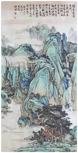 乔德龙将艺术思想、创作途径、风格特征与形式语言高度契合。总体来看,乔德龙的构图样式、造型特征、笔墨语言等展现出独特的艺术特色。第一,构图上,注重群山起伏的构成布局,运用青绿着色的块面去体现富有装饰性美感。而在青绿墨色的深浅交替变化上,以起伏缓冲的节奏韵律,付诸画面生韵效果。第二,造型上,乔德龙运用“线”的表现力度,展现山势之崎岖陡峭,树木向上生长的遒劲有力,体现自然界的生命之态。第三,笔墨语言的表达,乔德龙善于运用青绿赋彩的渐变层次,去呈现远近不同的画面,并采用山顶上的点笔和皴染去表现凹凸的山体结构,突出高山物象的美感特征。细究乔德龙的笔墨形象,我们不难看到,松散树木枝叶与坚实挺拔的山石所形成的“软”“硬”对比,使得画面表现形式丰富多样,物象之间的写意相得益彰。