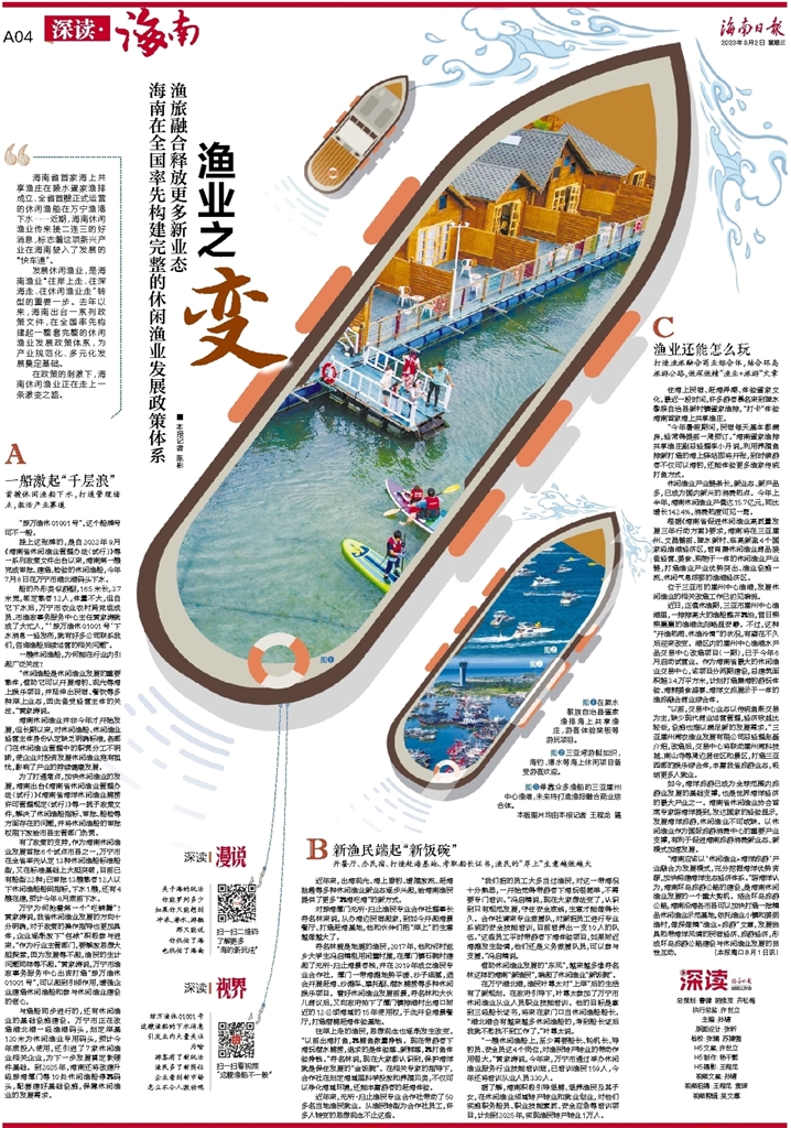 发展休闲渔业,是海南渔业“往岸上走、往深海走、往休闲渔业走”转型的重要一步。去年以来,海南出台一系列政策文件,在全国率先构建起一整套完整的休闲渔业发展政策体系,为产业规范化、多元化发展奠定基础。