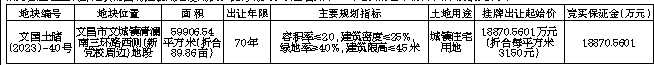 二、本次挂牌出让限房价,竞地价。按照出价高者且不低于底价者得的原则确定竞得人。同时,该宗地设定最高报价为20667.8万元(折合230万元/亩)。当竞买人持续竞价达到设定最高报价20667.8万元(折合230万元/亩)时,则网上交易系统转入以摇号方式确定竞得人。按照摇号规则,摇号中签者即为该宗地使用权竞得人。但仅有一位竞买人取得摇号资格,其余竞买人选择放弃时,则申请摇号的竞买人为该宗地使用权竞得人。三、竞买人资格:中华人民共和国境内外的法人、自然人或其他组织(法律另有规定者除外)均可申请参加竞买(注:失信被执行人不得参与本次竞买),申请人应单独申请竞买。本次挂牌不接受联合体竞买,不接受竞买人电话、邮寄、电子、口头报价。根据片区产业规划发展要求,保障安居房项目建设品质,该宗地竞买人资质由文昌市住房和城乡建设局初审。申请人应具备的其他条件:(一)申请人须具备上述竞买条件,并按规定缴交土地竞买保证金,经过审核我局将在规定的时间内确认其资格,签发竞买资格确认书。(二)经政府相关部门核实,在文昌市境内申请人存在下列情形之一的,申请人及其控股股东禁止参加挂牌:1.存在伪造公文骗取用地和非法倒卖土地等犯罪行为的;2.存在非法转让土地使用权等违法行为的;3.因企业原因造成土地闲置一年以上的;4.开发建设企业违背出让合同约定条件开发利用土地的;5.拖欠土地出让金的。四、开发建设要求:(一)竞得土地后,竞得人须当场签订《成交确认书》,并在签订《成交确认书》后20个工作日内签订《国有建设用地使用权出让合同》,合同签订后30天内付清全部土地出让金。(二)安居房套型建筑面积以100平方米以下中小套型为主,本项目装配式建筑装配率达到50%以上(住宅内装配式装修装配率也要达到50%以上),住宅室内装修标准不低于1000元/平方米。安居房的销售指导均价为8300元/平方米,地下车位每个销售价格不高于7万元。(三)安居房项目建设要严格按照《海南省人民政府关于加强新建住宅小区配套公共服务设施建设管理的意见》(琼府〔2017〕96号)要求建设配套设施。配套的基础设施和公共服务设施要与主体工程同步规划、同步建设、同步验收、同步交付使用。(四)竞得该宗土地后,竞得人须严格按照批准的项目规划设计方案要求,以及有关部门的行业规定,在签订合同之日起一年内动工建设项目,自动工之日起两年内竣工验收。不按批准的项目规划设计要求进行开发建设,以及不履行《国有建设用地使用权出让合同》约定的,报经市政府批准后,按该合同约定,退还除该合同约定的定金以外的全部或部分国有建设用地使用权出让价款(不计利息),收回国有建设用地使用权;受让人造成土地闲置,按照《海南自由贸易港闲置土地处置若干规定》执行。(五)本次出让宗地按净地条件出让,即土地权利清晰、安置补偿落实到位、地上附着物清表、无法律经济纠纷、土地开发利用规划条件明确、符合土壤环境质量要求、符合海南省政府(琼府〔2018〕3号)文件规定具备动工开发所必需条件。竞买人应当现场踏勘出让地块,竞买人申请参加竞买的,视为对出让地块净地条件无异议,在竞得土地后,竞得人须同意与出让人按该净地条件签订《国有建设用地交地确认书》确认出让地块交地开发建设。(六)按照《关于印发〈海南省产业用地控制指标〉的通知》(琼自然资用〔2023〕12号)和《关于实施产业项目发展和用地准入协议的指导意见》(琼国土资规〔2018〕8号)有关规定,本次出让宗地城镇住宅项目用地控制指标,投资强度为不低于400万元/亩,不设定年度产值指标和年度税收指标,开发建设的项目产值和税收征缴按照现行有关法规政策规定执行,达产年限5年。以上控制指标按规定列入《产业项目发展和用地准入协议》,属于协议内容的组成部分,竞得人在签订国有土地使用权出让合同时,一并与文昌市住房和城乡建设局签订《产业项目发展和用地准入协议》。(七)竞得土地后,竞得人拟在文昌市注册成立新公司进行开发建设的,应在竞买申请书中明确新公司的出资构成、成立时间等内容。(八)竞得土地后,竞得人须按规定完善该宗地施工报建、地质、压覆矿、消防、环保、土壤等审批手续,方可动工建设。(九)根据《文昌市住房和城乡建设局关于文国土储〔2023〕-40号地块建设项目绿色建筑等级和装配式建造意见的复函》,该宗地的竞得方应采用装配式方式建造;根据《海南省绿色建筑发展条例》的有关规定,城镇新建民用建筑的建设应当不低于绿色建筑基本级的要求,该地块的竞得方至少应按绿色建筑基本级进行设计。(十)该宗地安居房实行现房销售制度,按《商品房销售管理办法》(原建设部令第88号)有关规定执行。(十一)该宗地建成后的安居房销售对象为本省居民和引进人才。五、竞买申请:(一)本次挂牌出让的详细信息和具体要求,见挂牌出让手册及其他相关文件。手册和文件可从海南省建设用地使用权和矿业权网上交易系统(以下简称网上交易系统,网址:http://lr.hainan.gov.cn:9002)查看和打印。竞买人持CA数字证书实名登录网上交易系统进行相关操作,系统注册及证书办理详见《海南省建设用地使用权和矿业权网上交易系统用户手册》。挂牌出让文件所载内容亦为本公告的组成部分。(二)本次国有建设用地使用权实行网上