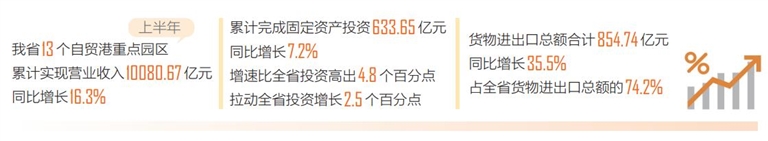数据显示,上半年,13个自贸港重点园区货物进出口总额合计854.74亿元,同比增长35.5%,占全省货物进出口总额的74.2%,较上年同期提高5.4个百分点。其中,货物进口总额619.99亿元,同比增长33.0%;货物出口总额234.75亿元,同比增长42.8%。