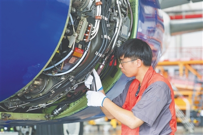 8月2日,在海南自贸港一站式飞机维修产业基地内,大新华飞机维修服务有限公司工作人员正在开展飞机发动机检修。这架波音737-800BCF飞机来自冰岛某租赁公司,是首架来海南自贸港开展维修服务的冰岛飞机,此次维修周期预计约15天,可享受进境维修免保证金等多项自贸港优惠政策。
