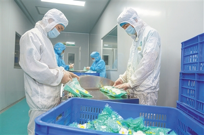 8月3日,在澄迈县的海蓝厨房食品加工(海南)有限公司里,工人在预制菜加工车间的流水线上有序作业。