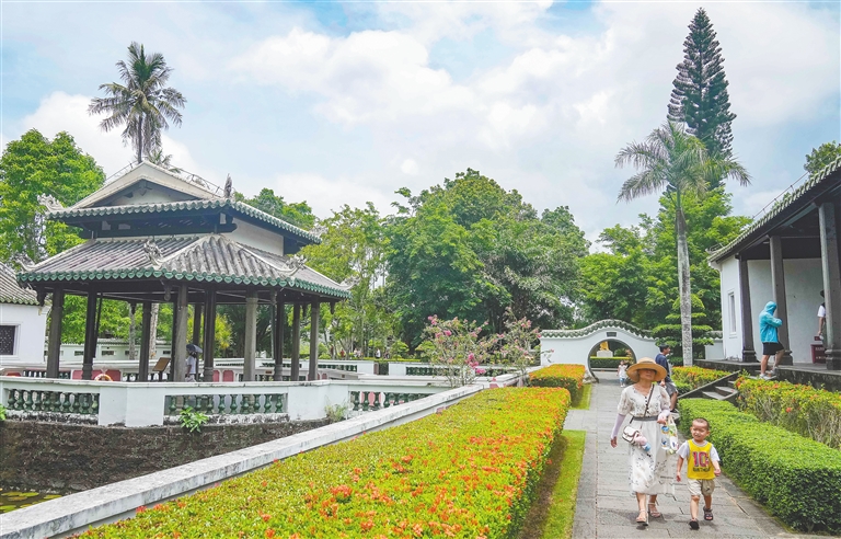 8月1日,在儋州市中和镇东坡书院,游人在参观游览,欣赏古建筑、吟诵东坡诗词、聆听东坡故事,深入了解东坡文化。