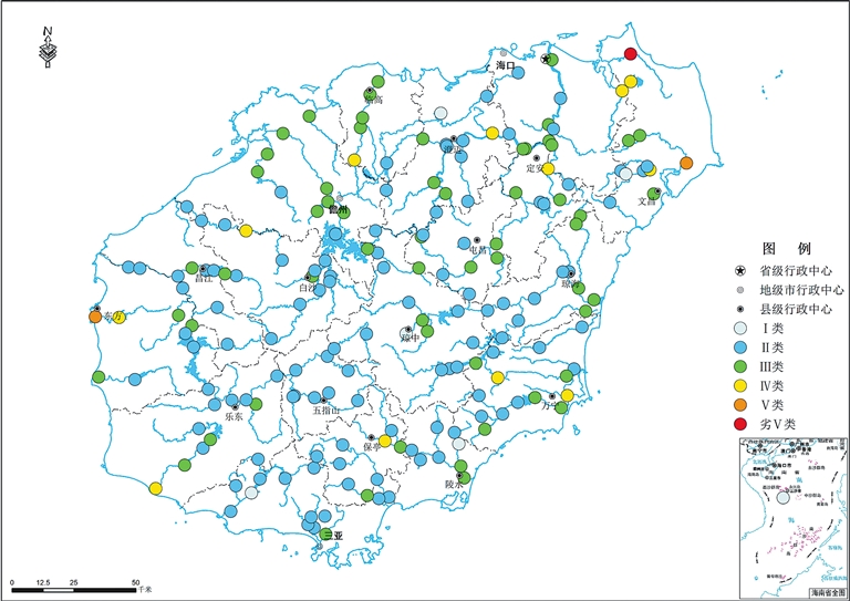 省控河流水质为优,水质优良比例为91.6%,Ⅳ~Ⅴ类比例为7.7%,劣Ⅴ类比例为0.7%。其中,南渡江、昌化江、万泉河流域和西北部、南海各岛诸河水质为优,南部诸河水质良好,东北部诸河水质轻度污染。142个监测断面中,珠溪河河口断面水质重度污染,罗带河罗带铁路桥和文教河坡柳水闸断面水质中度污染,文澜河光吉村、东山河后山村、望楼河乐罗、巡崖河龙湖镇、三更罗水三更罗镇、北山溪水涯新区、汶安河文安村、保亭水新星农场、演州河河口等9个断面水质轻度污染,其余断面水质优良。超Ⅲ类水质断面主要污染指标为高锰酸盐指数、总磷、化学需氧量,断面超标率分别为4.9%、4.9%、2.8%。