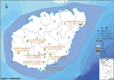 全省主要森林旅游区空气负离子浓度处于较高水平,霸王岭、尖峰岭、五指山、七仙岭、铜鼓岭、吊罗山、呀诺达、亚龙湾8个主要森林旅游区空气负离子平均浓度分别为7927个/立方厘米、6146个/立方厘米、5562个/立方厘米、3824个/立方厘米、4217个/立方厘米、7686个/立方厘米、8474个/立方厘米、6311个/立方厘米,均优于世界卫生组织规定清新空气1000~1500个/立方厘米的标准,对人体健康有利。