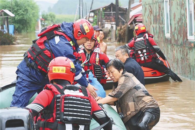 8月4日,在尚志市一面坡镇万山村,哈尔滨市森林消防支队的消防员正在解救被困村民。
