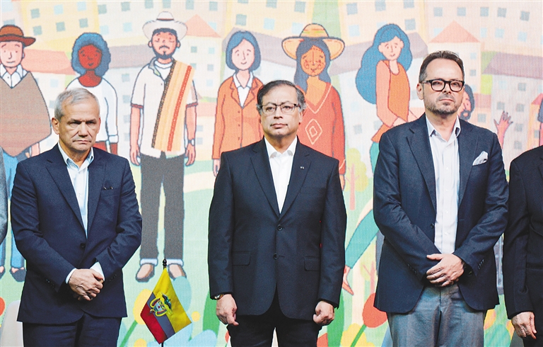 8月3日,在哥伦比亚首都波哥大,哥伦比亚总统佩特罗(中)等出席停火协议签署大会。