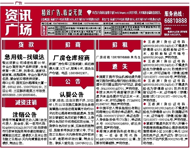 ●王杨庚(身份证号码: 460003198105134816)不慎遗失船名为琼儋渔40151的捕捞许可证一本,许可证编号:(琼儋)船捕(2019)HY-000199号,声明作废。