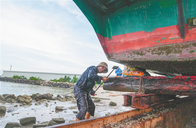 8月5日,在海口市美兰区演丰镇北港村,工人忙碌着为渔船清理底部的附着生物。据了解,海南今年持续三个半月的休渔时间将于8月16日12时结束,渔民在休渔期里清洁维修渔船、编织渔网,为开渔做足准备。本报记者 李天平 摄