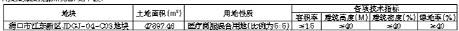 一、出让宗地的基本情况和规划指标要求:(一)基本情况及宗地净地情况:本次挂牌出让的用地位于海口市江东新区JDGJ-04-C03地块,土地面积为47897.46平方米(71.85亩),土地用途为医疗卫生和其他商业服务业用地(医疗卫生用地占50%,其他商业服务业用地占50%),土地出让年限为医疗卫生用地50年,其他商业服务业用地40年。目前地块安置补偿落实到位、地上附着物已清表、土地权利清晰、无法律经济纠纷、土地开发利用规划条件明确、土壤无污染,具备动工开发必需的条件。(二)主要规划指标:海口市江东新区JDGJ-04-C03地块用地的规划指标情况详见下表: