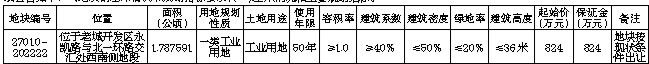 (二)其他规划控制条件。建筑退道路、绿化带红线距离:北侧建筑退绿化带红线距离12米;建筑退用地界线距离:东侧建筑退用地界线距离10米,应符合日照、消防、视觉卫生、防灾、抗震等要求;建筑间距满足国家、海南省的相关规定。机动车停车位按不少于0.15个/100平方米计容建筑面积标准配建。工业项目所需行政办公及生活服务设施用地面积不得超过工业项目总用地面积的7%,且建筑面积≤工业项目总建筑面积的15%。(三)宗地净地情况。该地块土地征收工作已完成,土地权属清晰,土地补偿款、安置补助费、青苗补助费和地上附着物等款项均已补偿到位。目前该地上的附着物已清表、无法律经济纠纷、土地开发利用规划条件明确、符合土壤环境质量要求。地块周边可以满足施工建设所需的水、电供应,相关设备、机械可以进场施工,具备净地出让的条件。经核查,该宗地不属于非法占地、违法建设行为已经处置到位并组织供应的土地。该地块不在系统污染或疑似污染地块范围内。二、本次国有建设用地使用权挂牌出让设有底价,按照出价最高且不低于底价的原则确定竞得人。三、开发建设要求:(一)按照《海南省建设用地出让控制指标(试行)》有关规定,该宗地块设定出让控制指标,具体如下:项目达产时间为签订《国有建设用地使用权出让合同》后的第3年,在约定达产时间内投资强度不低于466万元/亩;自项目达产之日起税收不低于 15 万元/亩/年,产值不低于746万元/亩/年。项目按 4 亩安置1名失地农民就业,在同等条件下优先招录本市县户籍居民。招录条件按人事劳动部门规定执行,同工同酬并遵照乙方规章制度管理。以上控制指标按规定列入《海南省产业项目发展和用地准入协议》,属于协议内容的组成部分。(二)其他开发建设要求。1.竞得人取得土地使用权后,应严格按照规划设计要求和《国有建设用地使用权出让合同》的约定进行开发建设。涉及水务、绿化、环保、消防、交通管理等的设计施工,应符合国家和海南省的有关管理规定。2.涉及装配式建筑的,按照我省装配式建筑相关规定和澄迈县住房和城乡建设局相关要求执行。3.该宗地块位于地质灾害易发区,项目建设前须按规定组织地质灾害危险性评估,采取措施防治地质灾害。4.竞得人应在按现状交地后三个月内开工建设,按海南省住房和城乡建设厅发布的《建设工程文明施工标准》(琼建定〔2016〕299号)在宗地范围内修建围墙。四、竞买申请:(一)竞买资格及要求。1.中华人民共和国境内外的自然人、法人和其他组织均可参加竞买(法律另有规定的除外)。属境外机构(含港、澳、台地区)申请参加竞买的,按照规定需要提交工商主管部门核发的《营业执照》。本次挂牌出让不接受联合竞买。2.失信被执行人不得参加本次竞买。3.根据海南老城科技新城入驻要求,竞买人及申请项目须符合海南老城科技新城产业规划以及准入条件。4.具有下列行为的自然人、法人和其他组织不得参加本次挂牌出让:(1)在澄迈县范围内有拖欠土地出让金的行为,并未及时改正的;(2)在澄迈县范围内有闲置土地,违法利用农村集体土地建设商品住房、擅自改变土地用途等违法行为,并未及时改正的。(二)交易资料获取方式。本次挂牌出让的详细信息和具体要求,见挂牌出让手册及其他相关文件。手册和文件可从海南省建设用地使用权和矿业权网上交易系统(网址:http://lr.hainan.gov.cn:9002)查看和打印,也可以到澄迈县土地交易所(澄迈县金江镇文化北路110-4号)咨询和领取。(三)竞买申请方式。本次交易活动竞买申请环节采取线下方式进行,有意竞买者请于2023年8月7日09时00分至2023年9月5日16时00分到澄迈县土地交易所提交书面申请,不接受电话、邮寄、口头等其他形式的申请。竞买申请地点:澄迈县土地交易所(澄迈县金江镇文化北路110-4号)。(四)竞买保证金。竞买申请人在竞买报名时须向指定账户足额缴存竞买保证金或使用银行保函方式提供竞买保证金。缴存竞买保证金的币种为人民币,不接受外币,且不属于银行贷款、股东借款、转贷和募集资金所得,并出具承诺。竞买保证金到账截止时间为:2023年9月5日16时00分(北京时间)。竞买人使用银行保函方式缴纳竞买保证金的,保函应为不可撤销、见索即付保函,保函担保金额应不少于全额土地竞买保证金,保函的保证期限应当自保函开立之日起至招标拍卖挂牌交易活动结束后不少于60日,保函需在保证金交纳截止时间前2个工作日内送达澄迈县自然资源和规划局。(五)资格确认。经审核,竞买申请人符合竞买资格,且竞买保证金或银行保函已按要求交纳的,澄迈县自然资源和规划局将发放《竞买资格确认书》,确认其获得竞买资格。竞买资格审核时间:2023年8月7日09时00分至2023年9月5日17时30分(北京时间)。五、挂牌报价时间及地点:(一)本次交易活动挂牌报价竞价环节采取线下方式进行,获得竞买资格的竞买人应持发放的《竞买资格确认书》到指定地点参与报价竞价活动。挂牌报价阶段仅接受书面报价,不接受电话、邮寄、电子、口头等其他方式报价。(二)挂牌报价时间:2023年8月28日09时00分至2023年9月7日10时00分,受理报价时间为工作日08时30分至11时30分、14时30分至17时00分(北京时间)。(三)挂牌报价地点:澄迈县土地交易所(澄迈县金江镇文化北路110-4号)。(四)挂牌现场会地点:海南省