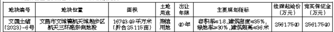 三、开发建设要求:(一)竞得土地后,竞得人须按照签订的《成交确认书》约定,在20个工作日内与文昌市自然资源和规划局签订《国有建设用地使用权出让合同》,合同签订后30天内付清全部土地出让金。(二)本次出让宗地属旅馆项目用地。须严格执行《关于加强商业、办公类建设项目全过程管理的意见》(琼自然资规〔2021〕12号)的有关规定。竞得该宗土地后,竞得人须在挂牌出让成交之日起六个月内完成项目规划设计方案,具备规划报建条件,并严格按照批准的项目规划设计方案要求,以及有关部门的行业规定,在签订出让合同之日起一年内动工建设项目、三年内竣工验收。不按批准的项目规划设计要求进行开发建设和不在一年内动工建设项目的,由受让人向出让人支付相当于宗地出让价款 1 ‰的违约金。受让人不履行《国有建设用地使用权出让合同》约定的,报经市政府批准后,按该合同约定,退还除该合同约定的定金以外的全部或部分国有建设用地使用权出让价款(不计利息),收回国有建设用地使用权;受让人造成土地闲置,按照《海南自由贸易港闲置土地处置若干规定》执行。(三)本次出让宗地按净地条件出让,即土地权利清晰,收回土地和地上附着物已补偿安置到位,无法律经济纠纷、土地开发利用规划条件明确、符合土壤环境质量要求、符合海南省政府(琼府〔2018〕3号)文件规定具备动工开发所必需条件。竞买人应当现场踏勘出让地块,竞买人申请参加竞买的,视为对出让地块净地条件无异议,在竞得土地后,竞得人须同意与出让人按该净地条件签订《国有建设用地交地确认书》确认出让地块交地开发建设。(四)按照《关于印发〈海南省产业用地控制指标〉的通知》(琼自然资用〔2023〕12号)和《关于实施产业项目发展和用地准入协议的指导意见》(琼国土资规〔2018〕8号)有关规定,本次出让宗地旅馆项目用地控制指标,在约定达产时间内的固定资产投资总额(为扣除土地出让价款之外的所有投资总额,均不含有关税费)不低于35000万元人民币,投资强度为不低于1000万元/亩;项目达产之日起,每五年累计的纳税总额不低于12500万元人民币,亩均年税收不低于50万元/亩;不设定年度产值指标,达产年限5年。以上控制指标按规定列入《产业项目发展和用地准入协议》(文国土储〔2023〕-6号),属于协议内容的组成部分,竞得人在签订国有土地使用权出让合同时,一并与文昌国际航天城管理局签订《产业项目发展和用地准入协议》(文国土储〔2023〕-6号)。(五)竞得土地后,竞得人拟在文昌国际航天城起步区注册成立新公司进行开发建设的,应在竞买申请书中明确新公司的出资构成、成立时间等内容。(六)竞得土地后,竞得人须按规定完善该宗地施工报建、地质、压覆矿、消防、环保、土壤等审批手续,方可动工建设。(七)根据《文昌市住房和城乡建设局关于文国土储〔2023〕-6号地块建设项目绿色建筑等级和装配式建造意见的复函》,该宗地的竞得方应采用装配式方式建造;根据《海南省绿色建筑发展条例》有关内容规定,该地块的竞得方至少应按绿色建筑基本级进行设计,如有单体超过二万平方米的大型公共建筑,则鼓励竞得方按不低于绿色建筑标准二星级标准建设。