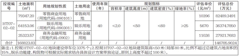 (一)挂牌出让宗地基本情况:本次挂牌出让宗地位于三亚海棠湾国家海岸休闲园区控规HT07-02-02地块,面积168823.83平方米,用地四至及界址坐标详见地块勘测定界图。经核查2022年10月14日经自然资源部批复的《三亚市国土空间总体规划(空间类2021—2035)》“三区三线”划定成果,该地块位于城镇开发边界(城镇集中建设区)内,不涉及占用永久基本农田、生态保护红线。同时,经核查《三亚海棠湾国家海岸休闲园区控制性详细规划(修编)》,该宗地规划用地性质为零售商业混合娱乐混合商务金融用地(用地代码:090101/090301/0902),对应土地用途亦为零售商业混合娱乐混合商务金融用地,兼容比例4.7:3.8:1.5。其中:1.零售商业用地,面积79347.20平方米;2.娱乐用地,面积64153.06平方米;3.商务金融用地,面积25323.57平方米。