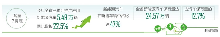 截至7月底,今年全省已累计推广应用新能源汽车5.49万辆,同比增长22.5%,新能源汽车在新增车辆中占比达47%,全省新能源汽车保有量24.57万辆,占汽车保有量的12.7%。