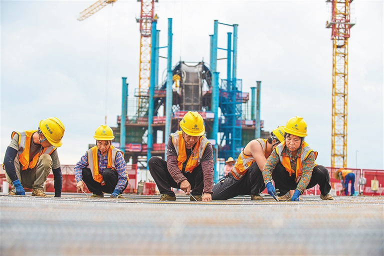 8月10日,博鳌乐城大桥项目现场,工人们在忙碌作业。目前该项目正在进行主塔中塔柱施工,大桥计划明年6月竣工交付。据介绍,该项目全长1.76公里,建成后将成为博鳌乐城国际医疗旅游先行区进入琼海市区、连接高速的主要通道。图/文 本报记者 袁琛 实习生 张赫宇