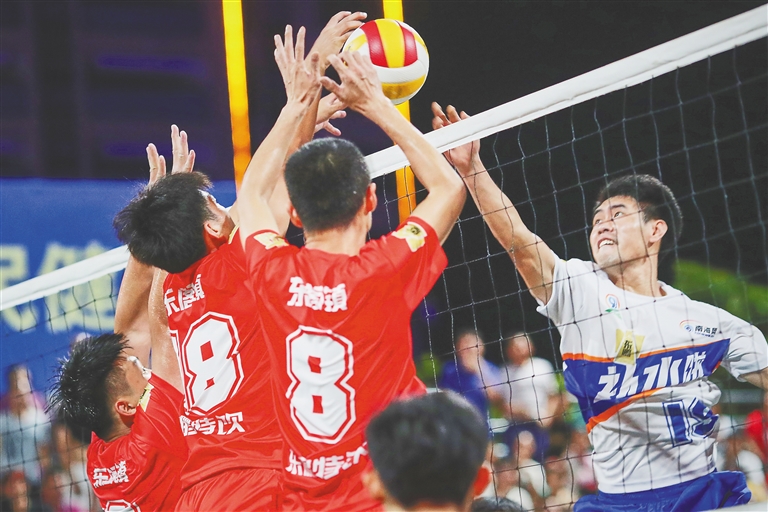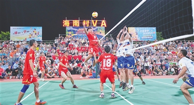 8月13日晚,2023年“九九杯”海南(文昌)乡镇排球联赛总决赛在文城镇收官,最终文昌东郊队以3:2的比分险胜东阁队,获得冠军。图为两支队伍在比赛中竞技。