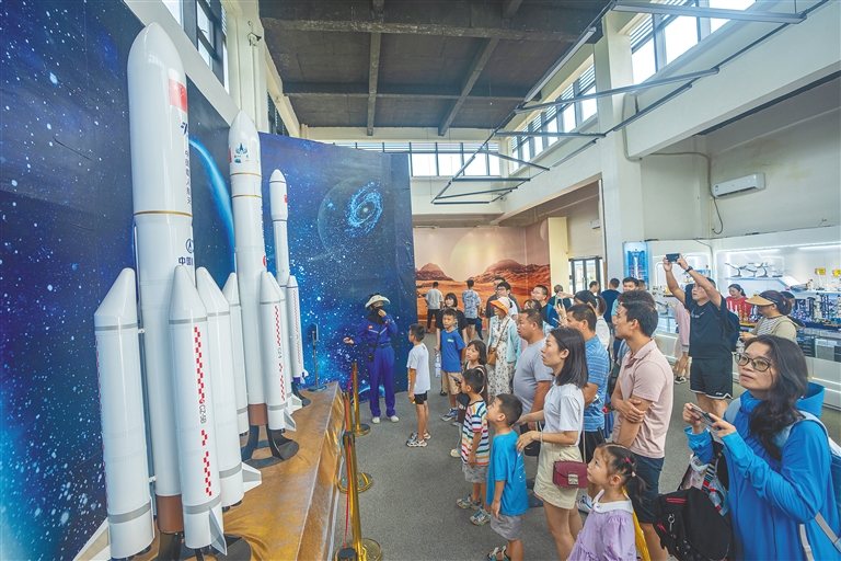 8月13日,不少家长选择带着孩子参观文昌航天科普中心。暑期,文昌航天研学活动持续升温、受到追捧,航天之旅成为研学游中的一抹亮色,让青少年更加了解航天历史、感悟航天文化。 本报记者 袁琛 摄