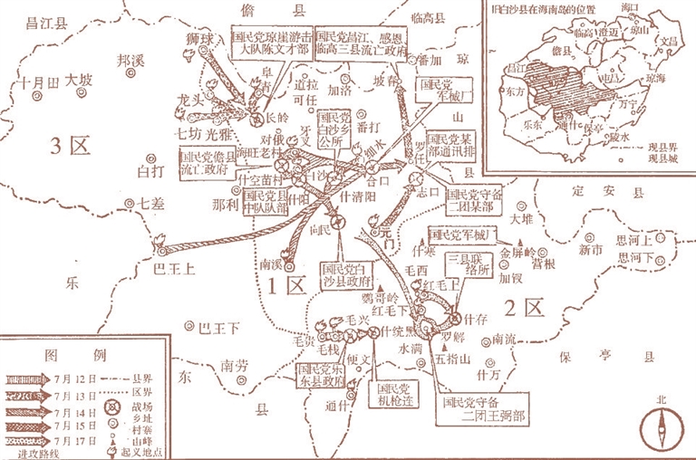 1943年8月12日,白沙一区白沙、细水、元门等乡的4000多名黎族苗族群众提前发动起义,手持弓箭、钩刀、粉枪、锄头、木棍等,如决堤之水,冲向国民党军政机关和部队驻地,标志着白沙起义爆发。此后的半个月时间里,白沙各区的黎族苗族群众用手中的简易武器,打死打伤国民党军政人员300余人,缴获了一批枪支弹药。