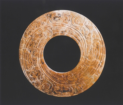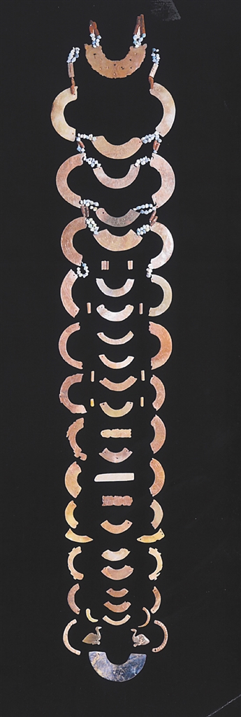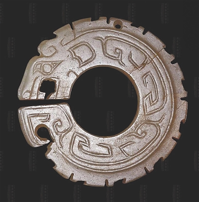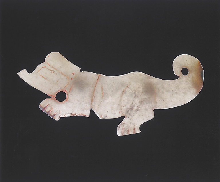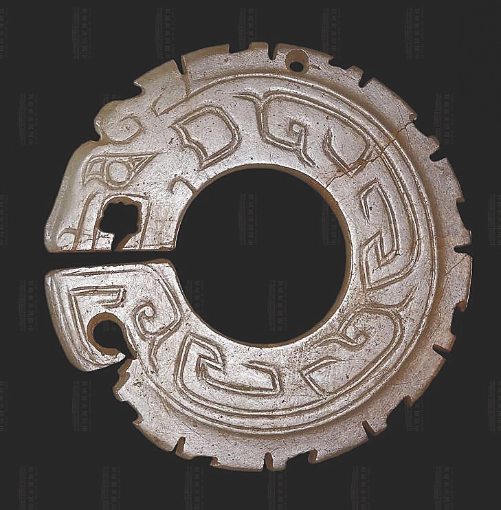 玉璜也是片中玉组佩的重要饰件之一,大多以横向放置的形态与玉管、玉珠等组成佩饰。民间传说中,姜太公曾垂钓于秦川渭水之畔,一日钓得一条红色鲤鱼,剖开鱼腹发现一个玉璜,上面刻有9个篆字:“姬受命吕佐之报于齐”,意思是周文王将受天命请吕尚辅佐,西周灭亡殷商后,吕尚会因功受封于齐地。