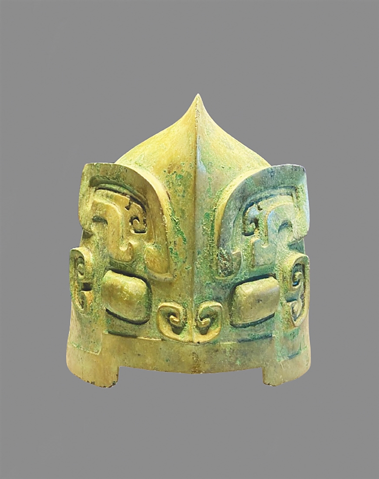 兽面纹又称饕餮纹,常以动物的面目形象出现,有牛首、虎首、龙角形等,神秘肃穆,凶猛庄严。兽面纹是不少商至西周早期青铜器的主纹饰,在电影中商纣王和质子营的胄甲、铜剑、鼓面等道具上都曾出现。胄是士兵作战时使用的头盔。质子营的胄确实有商代风格,与江西省新干县大洋洲大墓出土的青铜胄极为相似,都有高浮雕的兽面纹,凸脊纵向高耸,后部顶端有一圆孔可以插翎羽。这种带兽面纹的胄,在商代遗迹中曾出土过多件,既具有防护头部的实用价值,又兼具艺术的美感。