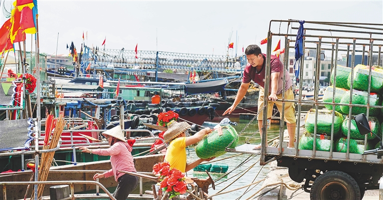 8月15日,在儋州市白马井中心渔港,平静了3个半月的码头开始热闹起来,渔民纷纷为开渔进行物资储备等准备工作,现场一片忙碌的景象。本报记者 陈元才 摄