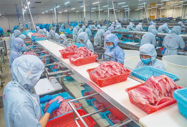 8月10日临近中午时分,新鲜的罗非鱼陆续被送来,海南翔泰渔业股份有限公司的生产车间逐渐热闹起来。