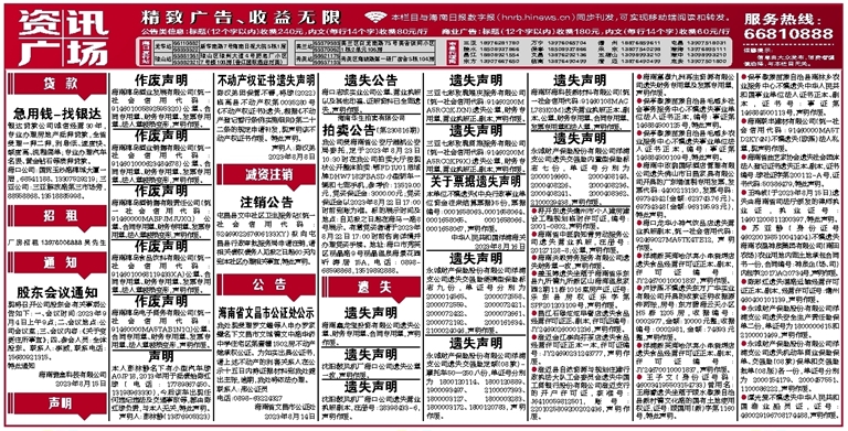 我公司受海南省公安厅港航公安局委托,定于2023年8月23日10:30时在我公司拍卖大厅按现状公开整体拍卖:鄂FD1U01思域牌DHW7182FBASD小型轿车一辆和七部手机,参考价:13519.00元,竞买保证金:3000.00元;竞买保证金以2023年8月22日17:00时前到账为准。标的展示时间及地点:自见报之日起在海马一路8号展示。有意竞买者请于2023年8月22日17:00时前咨询详情并办理竞买手续。地址:海口市秀英区丽晶路9号丽晶温泉海景花园听涛居15A,电话:0898-68598868,13519892888。