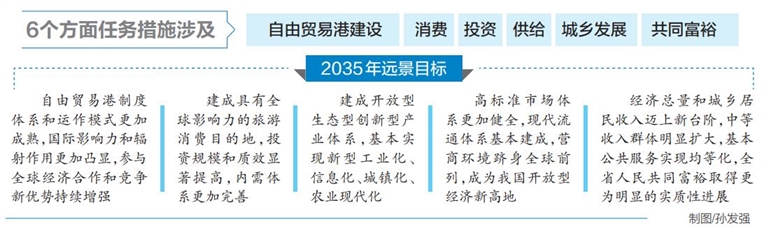 围绕发展目标,《行动方案》提出6个方面任务措施,分别涉及自由贸易港建设、消费、投资、供给、城乡发展与共同富裕。