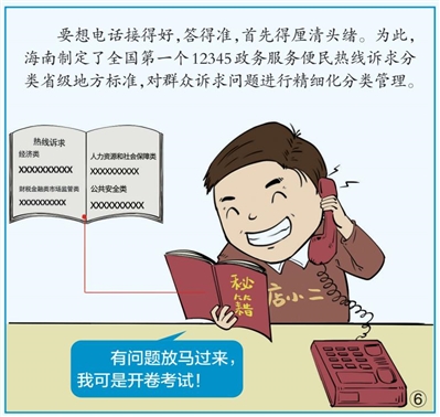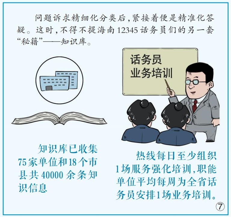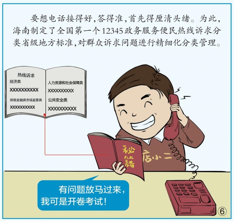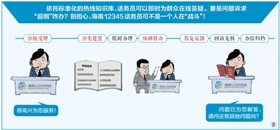这个一天24小时、一年365天无休,海南政务服务的“总客服”,从2016年全省月均话务量不足5万通,到现在月均话务量稳定在近70万通。粗略计算,如今海南12345热线差不多1个小时受理话务量900多通,却仍能在按时办结率和满意率上不断提高,原因何在?在于其背后有一套“秘籍”,即建立了一整套的标准体系。如建立了全国第一个省域12345便民热线诉求分类标准;知识库已收集75家单位和18个市县共40000余条知识信息;还有“五统一”、“2+3”标准体系等。有标准,就有了遵循,效率自然就提升了。“标准+培训”,好服务自然“信手拈来”;“秘籍+苦练”,民生堵点就能一一破解。