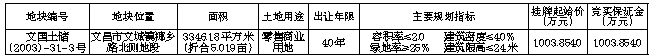 二、竞买人资格:中华人民共和国境内外的法人、自然人或其他组织(法律另有规定者除外)均可申请参加竞买(注:失信被执行人不得参与本次竞买),申请人应单独申请竞买。本次挂牌不接受联合体竞买,不接受竞买人电话、邮寄、电子、口头报价。申请人应具备的其他条件:(一)申请人须具备竞买条件,并按规定缴交土地竞买保证金,经过审核我局将在规定的时间内确认其资格,签发竞买资格确认书。(二)经政府相关部门核实,在文昌市境内申请人存在下列情形之一的,申请人及其控股股东禁止参加挂牌:(1)存在伪造公文骗取用地和非法倒卖土地等犯罪行为的;(2)存在非法转让土地使用权等违法行为的;(3)因企业原因造成土地闲置一年以上的;(4)开发建设企业违背出让合同约定条件开发利用土地的;(5)拖欠土地出让金的。三、开发建设要求:(一)竞得土地后,竞得人须按照签订的《成交确认书》约定,在20个工作日内与文昌市自然资源和规划局签订《国有建设用地使用权出让合同》,合同签订后30天内付清全部土地出让金。(二)本次出让宗地属零售商业项目用地。须严格执行《关于加强商业、办公类建设项目全过程管理的意见》(琼自然资规〔2021〕12号)的有关规定。竞得该宗土地后,竞得人须在挂牌出让成交之日起二个月内完成项目规划设计方案,具备规划报建条件,并严格按照批准的项目规划设计方案要求,以及有关部门的行业规定,在签订出让合同之日起三个月内动工建设项目、一年半内完成项目的投资建设。不按批准的项目规划设计要求进行开发建设和不在三个月内动工建设项目的,由受让人向出让人支付相当于宗地出让价款 1 ‰的违约金。受让人不履行《国有建设用地使用权出让合同》约定的,报经市政府批准后,按该合同约定,退还除该合同约定的定金以外的全部或部分国有建设用地使用权出让价款(不计利息),收回国有建设用地使用权;受让人造成土地闲置,按照《海南自由贸易港闲置土地处置若干规定》执行。(三)本次出让宗地按净地条件出让,即土地权利清晰,收回土地和地上附着物已补偿安置到位,无法律经济纠纷、土地开发利用规划条件明确、符合土壤环境质量要求、符合海南省政府(琼府〔2018〕3号)文件规定具备动工开发所必需条件。竞买人应当现场踏勘出让地块,竞买人申请参加竞买的,视为对出让地块净地条件无异议,在竞得土地后,竞得人须同意与出让人按该净地条件签订《国有建设用地交地确认书》确认出让地块交地开发建设。(四)按照《关于印发〈海南省产业用地控制指标〉的通知》(琼自然资用〔2023〕12号)和《关于实施产业项目发展和用地准入协议的指导意见》(琼国土资规〔2018〕8号)有关规定,本次出让宗地零售商业项目用地控制指标,投资强度为不低于400万元/亩,不设定年度产值指标和年度税收指标,开发建设的项目产值和税收征缴按照现行有关法规政策规定执行,达产年限5年。以上控制指标按规定列入《产业项目发展和用地准入协议》(文国土储〔2003〕-31-3号),属于协议内容的组成部分,竞得人在签订国有土地使用权出让合同时,一并与文昌市发展和改革委员会签订《产业项目发展和用地准入协议》(文国土储〔2003〕-31-3号)。(五)竞得土地后,竞得人拟在文昌市注册成立新公司进行开发建设的,应在竞买申请书中明确新公司的出资构成、成立时间等内容。(六)竞得土地后,竞得人须按规定完善该宗地施工报建、地质、压覆矿、消防、环保、土壤等审批手续,方可动工建设。(七)根据《文昌市住房和城乡建设局关于文国土储〔2003〕-31-3号地块建设项目绿色建筑等级和装配式建造意见的复函》,该宗地的竞得方应采用装配式方式建造,根据《海南省绿色建筑发展条例》的有关规定,城镇新建民用建筑的建设应当不低于绿色建筑基本级的要求,该地块的竞得方至少应按绿色建筑基本级进行设计。四、竞买申请:(一)本次挂牌出让宗地的详细资料和具体要求,详见挂牌出让文件。手册和文件可从海南省建设用地使用权和矿业权网上交易系统(以下简称网上交易系统,网址:http://lr.hainan.gov.cn:9002)查看和打印。竞买人持CA数字证书实名登录网上交易系统进行相关操作,系统注册及证书办理详见《海南省建设用地使用权和矿业权网上交易系统用户手册》。挂牌出让文件所载内容亦为本公告的组成部分。(二)本次国有建设用地使用权实行网上挂牌出让,有意向的竞买人可登录网上交易系统提交竞买申请,按要求上传竞买申请文件。不接受电话、邮寄、书面、口头等其他形式的申请。竞买申请时间:2023年8月18日08时30分至2023年9月18日17时00分(以网上交易系统服务器时间为准,下同)。(三)竞买人在网上交易系统提交竞买申请时,应选定一家银行交纳竞买保证金,选定银行后系统自动生成唯一的随机竞买保证金账号,保证金交纳银行一经选定不能更改,竞买人应谨慎选择。竞买人须按照出让手册的有关规定将竞买保证金足额交入该账号(竞买保证金到账时间以银行信息系统入账时间为准)。本次竞买保证金的币种为人民币,不接受外币。竞买保证金应不属于银行贷款、股东借款、转贷和募集资金所得,并出具承诺。竞买保证金截止时间:2023年9月18日17时00分(以银行系统记录到账时间为准)。五、资格确认:竞买资格审核开始后,出让人在2个工作日内、资格