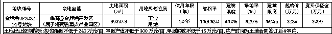 二、本次挂牌出让设有底价,按照出价最高且不低于底价者得的原则确定竞得人。三、开发建设要求:(一)该宗地拟作为装配式产业项目使用,出让地块须统一规划、统一开发,建设须符合《临高金牌港经济开发区控制性详细规划》要求,生产配套满足规划要求,厂房风貌满足规划要求。(二)竞得人须在签订《挂牌出让成交确认书》后,5个工作日内与临高县工业和信息化服务中心签订《海南省产业项目发展和用地准入协议》,20个工作日内与临高县自然资源和规划局签订《国有建设用地使用权出让合同》,并严格按照约定内容进行开发建设,否则将承担相关违约责任。(三)竞得人出资比例结构、项目公司股权结构未经土地所在地人民政府批准不得发生变动。(四)竞得人取得土地使用权后,应依法建设使用土地和管理土地,切实履行《国有建设用地使用权出让合同》中的权利和义务。四、竞买申请:(一)竞买人资格:1.中华人民共和国境内外的法人、自然人或其他组织(法律另有规定者除外)均可申请参加竞买(注:失信被执行人不得参加本次竞买),申请人应单独申请,不接受联合体竞买。2.经政府相关部门核实,存在下列情形之一的,申请人及其控股股东禁止参加竞买:(1)存在伪造公文骗取用地和非法倒卖土地等犯罪行为的;(2)存在非法转让土地使用权等违法行为的;(3)因企业原因造成土地闲置一年以上的;(4)拖欠土地出让金的。(二)本次挂牌出让的详细信息、风险提示和具体要求等,见挂牌出让手册及其他相关文件。手册和文件可从海南省建设用地使用权和矿业权网上交易系统(以下简称网上交易系统,网址:http://lr.hainan.gov.cn:9002)查看和打印。(三)有意向的竞买人可登录网上交易系统提交竞买申请,按要求上传竞买申请文件。本次交易不接受电话、邮寄、书面、口头等其他形式的申请。竞买申请时间:2023年8月18日08:30至2023年9月15日17:00(以网上交易系统服务器时间为准,下同)。(四)竞买人在网上交易系统提交竞买申请时,须按照挂牌出让手册的有关规定足额缴存竞买保证金或使用银行保函方式提供竞买保证金。竞买保证金到账截止时间:2023年9月15日17:00。(五)竞买人的竞买申请文件审核通过,且竞买保证金已按要求交纳的,网上交易系统自动发放《竞买资格确认书》,确认其获得竞买资格。竞买资格审核时间:2023年9月8日08:30至2023年9月15日17:30。五、挂牌报价时间及网址: (一)挂牌报价时间为:2023年9月8日08:30至2023年9月18日10:00。(二)挂牌网址:网上交易系统(http://lr.hainan.gov.cn:9002/)。(三)网上挂牌报价时间截止时,无竞买人报价,挂牌活动自动结束;有竞买人报价,网上交易系统限时5分钟在线询问,有竞买人在此规定时限内表示愿意参与网上限时竞价的,系统自动进入网上限时竞价程序,以竞价方式确定竞得人。六、该地块安置补助费已落实到位,地上附着物已清表,土地权利清晰,无法律经济纠纷;不存在土壤污染,符合土壤环境质量要求;宗地已基本完成土地平整,地块周边可以满足施工建设所需的水、电供应,相关设备、机械可以进场施工,具备动工开发必需的条件。七、该地块已完成地质灾害、压覆矿产、水土保持、地震安全、气候可行性等区域评估和普查工作,符合标准地出让形式。八、本公告未尽事宜详见《临高县国有建设用地使用权挂牌出让手册》以及网上交易系统提供的相关文件,其所载内容为本公告的组成部分。九、咨询方式:孙女士 18976767729;查询网址:http://zw.hainan.gov.cn/ggzy/、http://lr.hainan.gov.cn、http://lr.hainan.gov.cn:9002/。