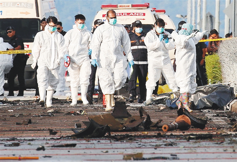8月17日,工作人员在马来西亚雪兰莪州沙阿兰市查看飞机失事现场。