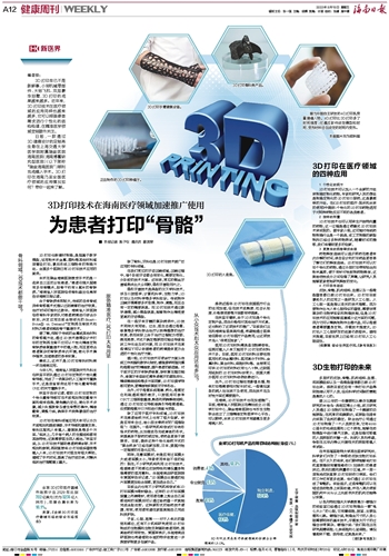 在海南,3D打印技术也在加速推广。目前,海南省人民医院正在筹划成立3D医学打印中心,瑞金海南医院也与苏生生物联合成立了三维精准定制医学中心平台。可以期待,未来3D打印技术有望惠及更多海南人民。