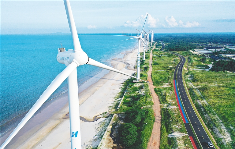 8月18日,航拍海南环岛旅游公路文昌木兰湾段。在海南环岛旅游公路文昌木兰湾段,风车、海水、沙滩与公路一起,形成别样的景观。