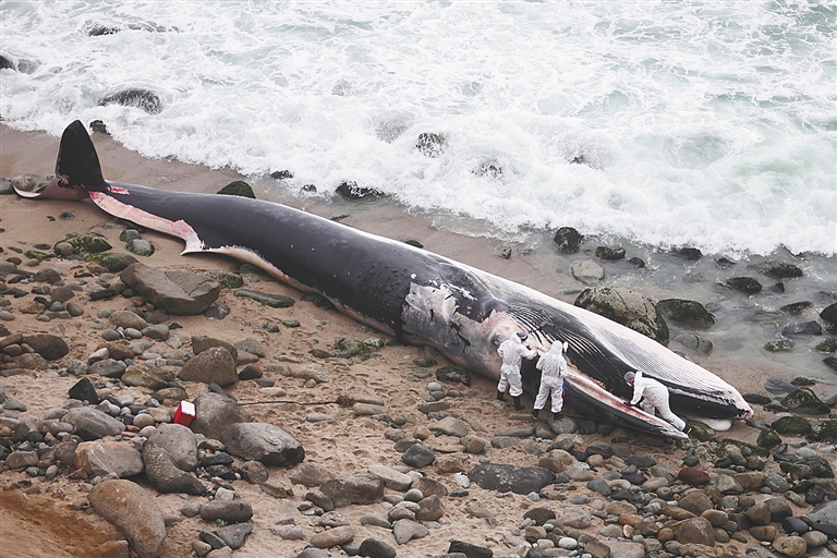 8月18日,科研人员在秘鲁利马的一处海滩查看搁浅的鲸。新华社/路透
