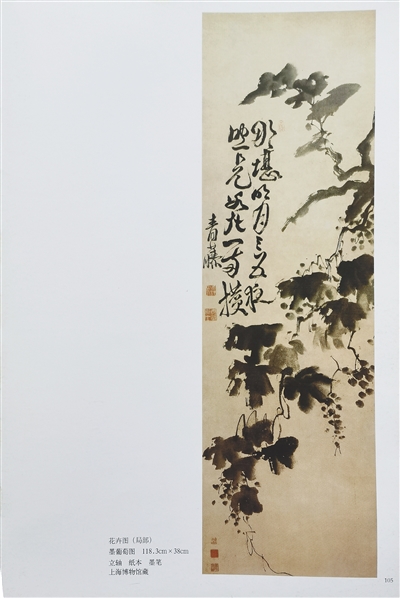 徐渭画作题材广泛,葡萄是他笔下喜欢的题材之一,一生创作了《葡萄图》《墨葡萄图》《松鼠葡萄图》《水墨葡萄》等许多葡萄名画。他对笔下的葡萄,擅于运用勾、点、泼、皴等多种笔墨形态,将葡萄神韵刻画得入木三分,在画面中尽显豪放境界。如本文配图《墨葡萄图》立轴,其大小为118.3cm×38cm,纸本,墨笔,现藏于上海博物馆。