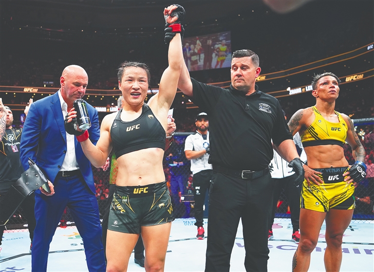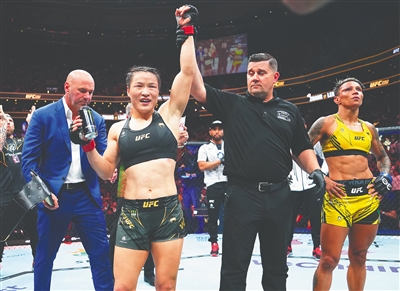 8月19日,在美国波士顿举行的UFC292比赛中,现任女子草量级冠军、中国选手张伟丽战胜巴西选手莱莫斯,卫冕金腰带。图为裁判宣布张伟丽(前左)在比赛中获胜。新华社发